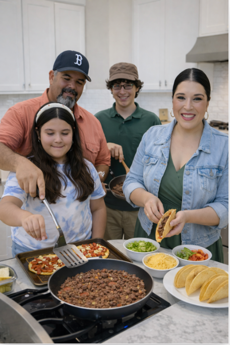 El padre, con un delantal que aĂşn no dominaba, estaba frente a la estufa con una mezcla de seriedad y humor. Intentaba cocinar lo mejor posible, aunque a veces recibĂa “indicaciones” de los pequeños chefs de la casa.