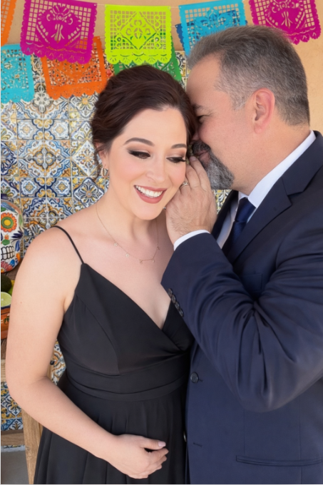 Ella está ahí, con un elegante vestido negro, sonriendo como si fuera algo cotidiano… pero para él, nunca deja de ser especial.