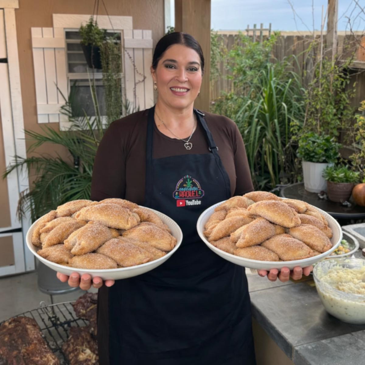 Las empanadas que ves en la imagen tienen todo lo que enamora: masa dorada y crujiente, cubiertas con azúcar y canela aromática, y un interior suave y cremoso. Son ideales para reuniones, meriendas o para emprender vendiéndolas como postre artesanal.
