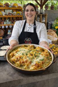Estas deliciosas enchiladas horneadas llevan tortillas suaves rellenas de pollo y bañadas en una salsa espesa, cubiertas con abundante queso gratinado. Un platillo rendidor, reconfortante y perfecto para compartir en familia o para menú de fin de semana.